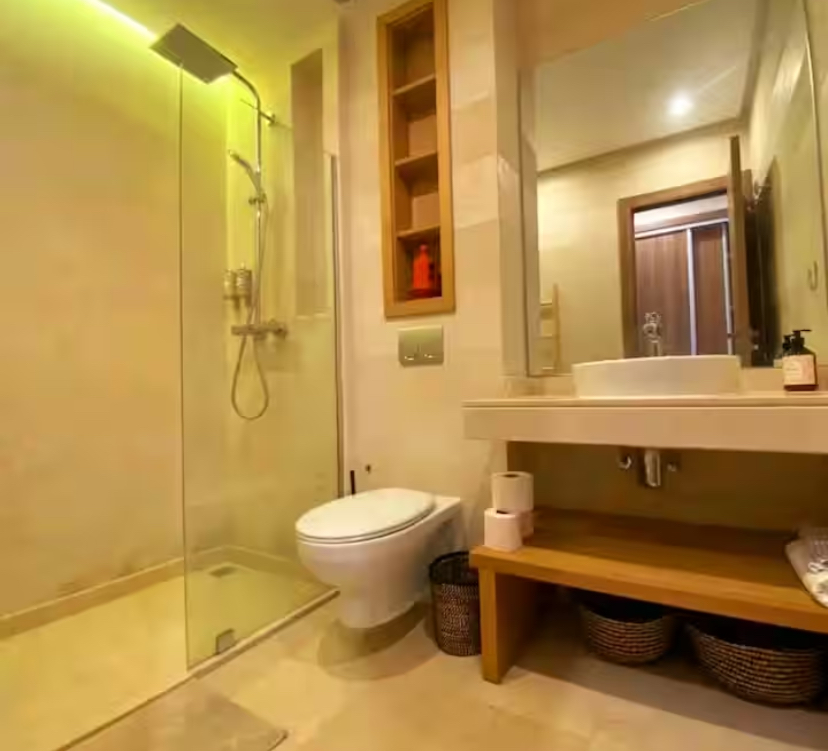 – Salle de bain : douche à l’italienne, produits cosmétiques, sèche-cheveux, serviettes.